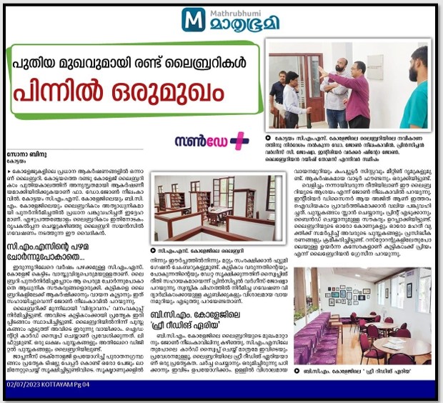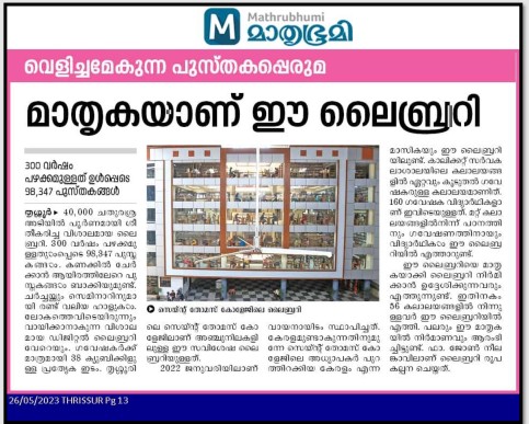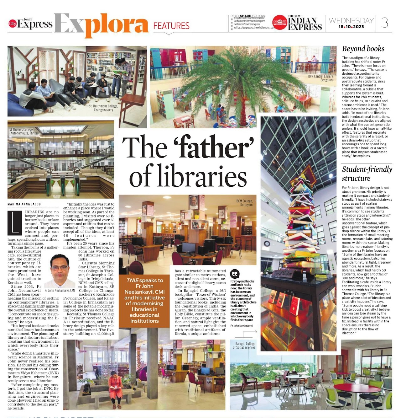 "St. Thomas College (Autonomous), Thrissur, recently constructed a library with 42000 SF built area with the planning and designing of Dr. John Neelankavil CMI. The Librarian and Faculty of Philosophy, Dharmaram Vidya Kshetram, Pontifical Athenaeum, Bengaluru."